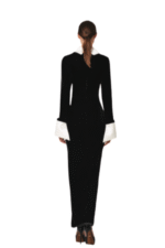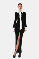 Description: A black velvet cocktail dress with silk sleeve and neck, tied detail, and high slit. Fabric Composition: Black velvet