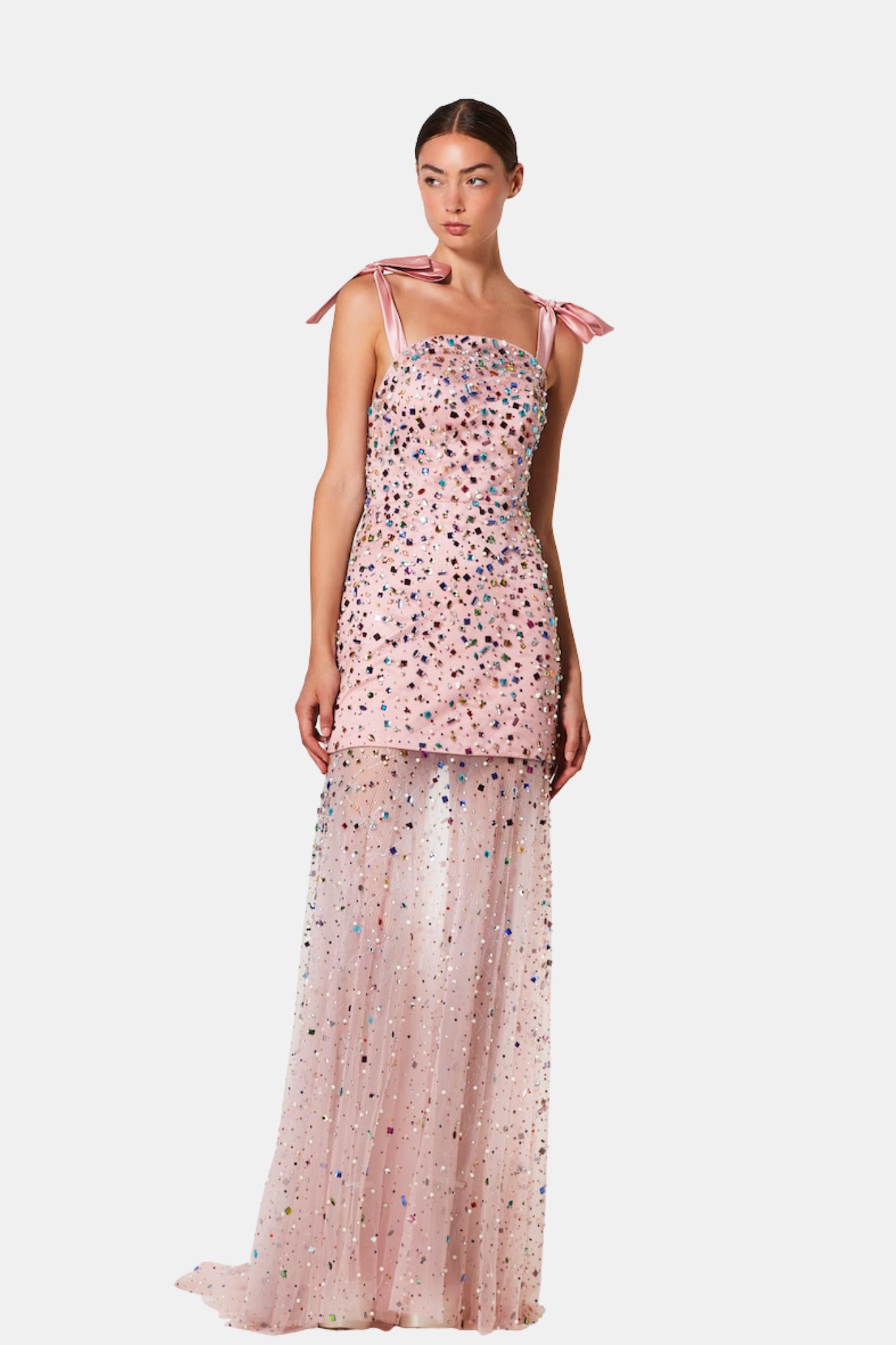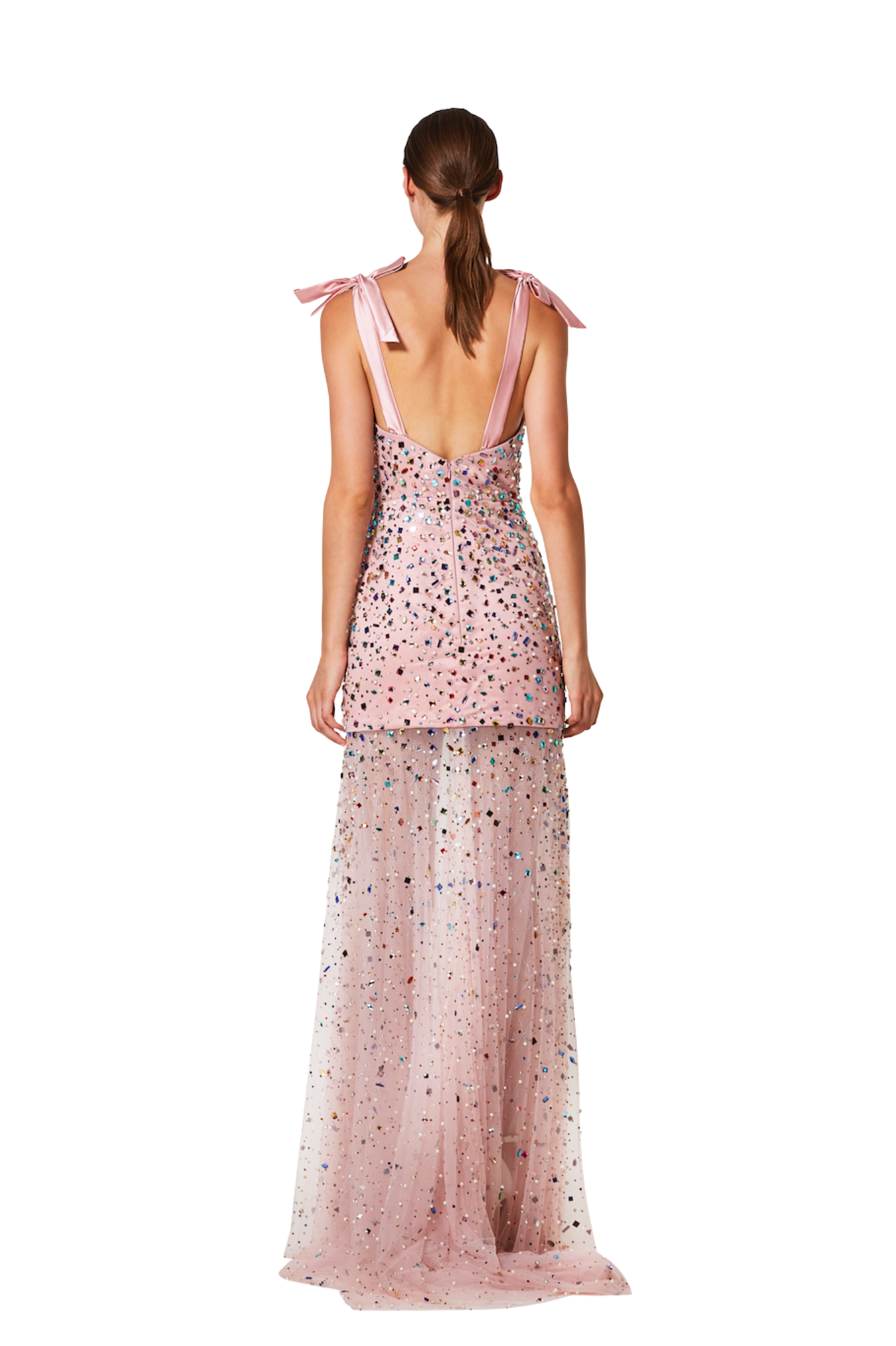 Description: All-over hand-beaded silk tulle top with Duchess satin gown.