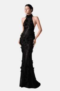Description: A black off-shoulder gown featuring voluminous sculpted sleeves and a deep neckline. Designed with a fitted silhouette that flows into a soft train.