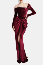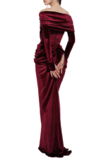 The *Quinn Dress* is a dramatic and structured velvet gown featuring a sculpted corset, matching gloves, and a mermaid silhouette—perfect for a bold, elegant entrance.