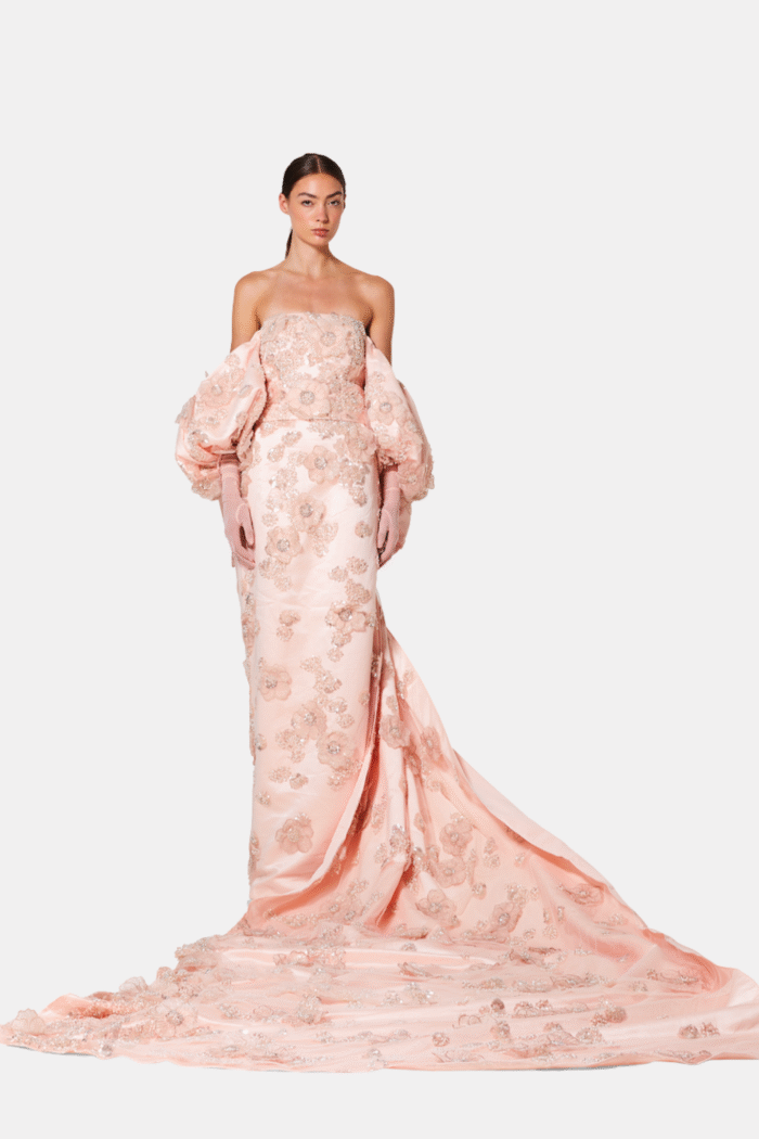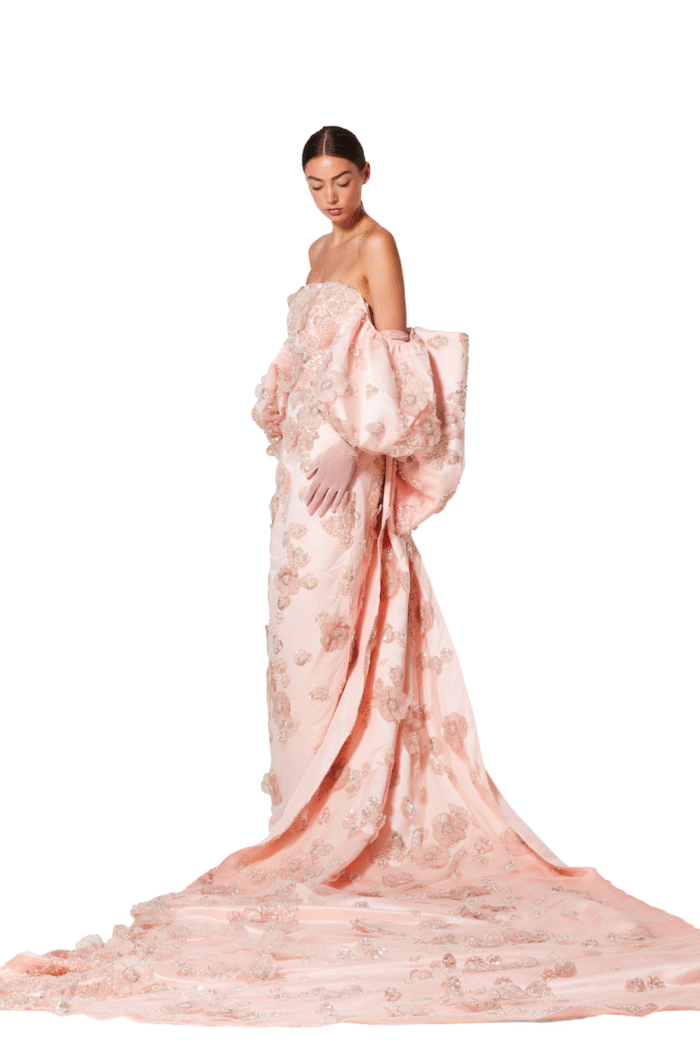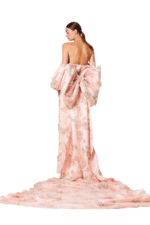 Description: Duchess satin gown with detachable bow detail, detachable belt, ruffle sleeves, and an incredible elongated train.